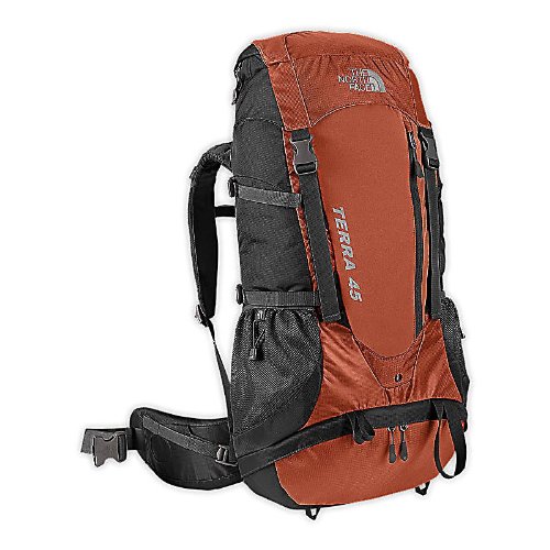 The North Face Rhumba Orange Cover a lot of ground without being weighed down with The North Face Terra 45. This durable, hydration compatible, 45-liter pack is a journeyman favorite because it delivers the comfort and features you need for the trail. It has plenty of space for your gear and pockets to keep it all organized. Great for one to two day trips, this pack has a deluxe vertical mesh channel on the back panel that provides cooling comfort. An adjustable strapping system rounds out the comfort feature list. The Terra 45 also has lash points and loops for tools and trekking poles, improved sleeping bag compartment, and safety whistle. As part of the Terra collection, this pack combines novice-friendly features with seasoned outdoorsman performance all for one affordable price.Material: 420D polyester dobby, 420D mini ripstop polyester Travel Backpacks,Overnight Packs,Backpacking Packs,Last Minute Gifts,Hiking Backpacks,Backpacks,The North Face,Great Gifts for DadRead more The North Face Terra 45